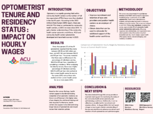 In July 2023, ACU piloted a brief survey that focused on community health center optometrists asking them about tenure, residency completion, expected number of patient visits per day, and more. This survey was a key first step in understanding the optometry workforce. To learn more about the findings, access the 2023 Community Health Center Optometry Workforce Survey report and Optometrist Tenure and Residency Status: Impact on Hourly Wages poster, presented at ACU’s 2024 Annual Conference.