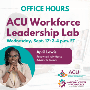 Join ACU’s National Center for Workforce Development & Training and renowned workforce advisor April Lewis on Sept. 17 for a rescheduled kickoff of our first Leadership Lab! After a previous technical issue, ACU will be rehosting this exciting convening, the first in our ongoing series to equip healthcare leaders with real-time coaching, peer learning, and more. Whether you’re managing a team, leading an initiative, or supporting frontline staff, these free, monthly workforce office hours will help you learn to lead: sign up now to refuel your leadership tank, hear what’s working in the field, and stay connected to your mission.