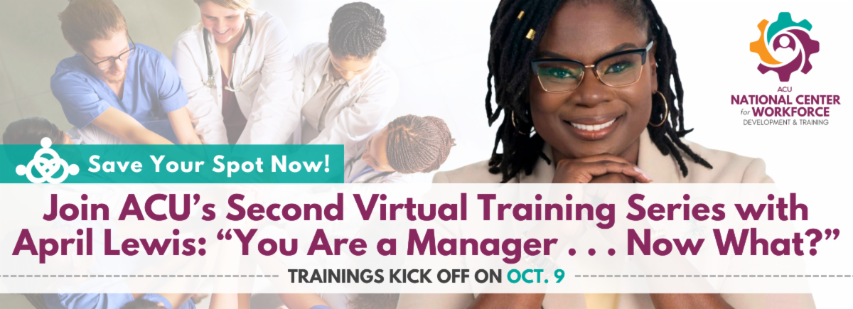 Join renowned workforce expert April Lewis for the second iteration of our virtual training series, “You Are a Manager . . . Now What?” Returning by popular demand, this unique series of interactive seminars in October will equip new and experienced managers with essential tools to lead multifaceted, high-functioning teams. Facilitated by national workforce expert April Lewis, Director of ACU’s National Center for Workforce Development & Training, the series will help you learn how to foster a positive workplace culture, develop and communicate a clear strategic vision, and more in four 90-minute sessions. Browse session descriptions and learn more about this learning series. ACU Members receive significant registration discounts. Registration has closed. If you are interested in a future iteration of this training or in bringing this series to your institution, please contact us!