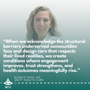 In this edition, we’re honored to feature Blanca Toso, DO, Associate Chief Medical Officer at Unity Health Care and a member of ACU’s Membership Committee. A physician and National Health Service Corps (NHSC) scholar, Dr. Toso brings nearly two decades of experience caring for underserved populations and leading health center teams with empathy, purpose, and vision.